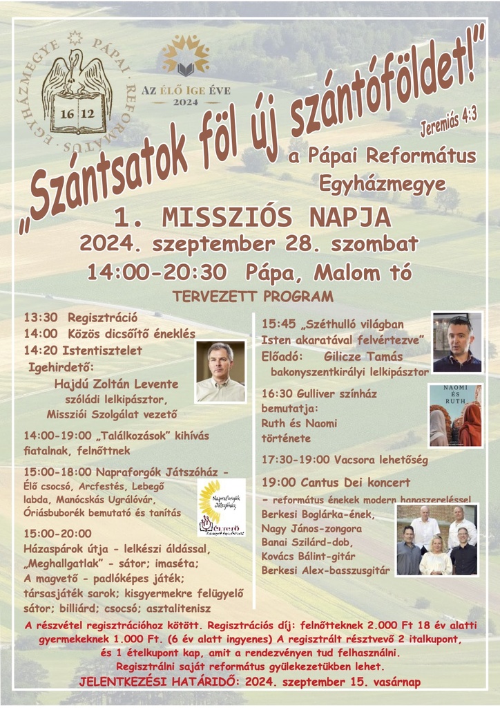 A tettek mezejére, egész pontosan Pápára a Malom-Tóhoz hívunk minden kedves érdeklődőt, akiben túlcsordul már a felelősségvállalás feszültsége. De azt is, akiben még csak halkan csobog a tettvágy. Hívunk és várunk Mindenkit, hogy bölcsen tudjunk és merjünk is új szántóföldet szántani. Legnagyobb kincsünk, hogy Isten megváltottai lehetünk, nem egymás kizsákmányolói. Szántsuk fel a kapcsolataink közé ékelődött és a kényelem világában parlagon hagyott lelki szántóföldeket! Szánjunk időt, teret és jóindulatot egymásra Szeptember 28-án délután, mert megmaradásunk kulcsa az egymásért felelősséget vállaló közösség.