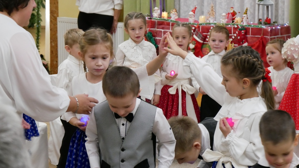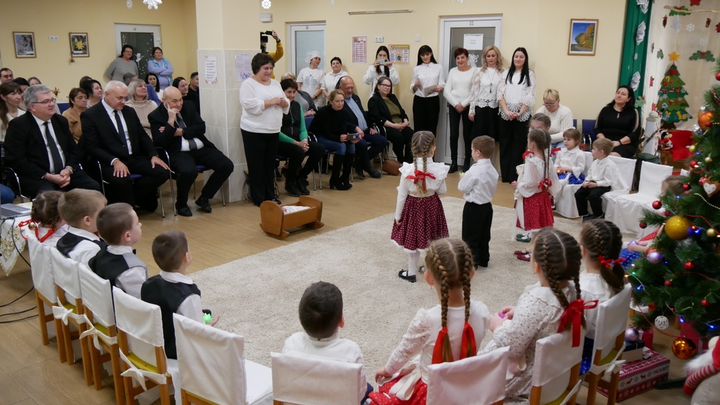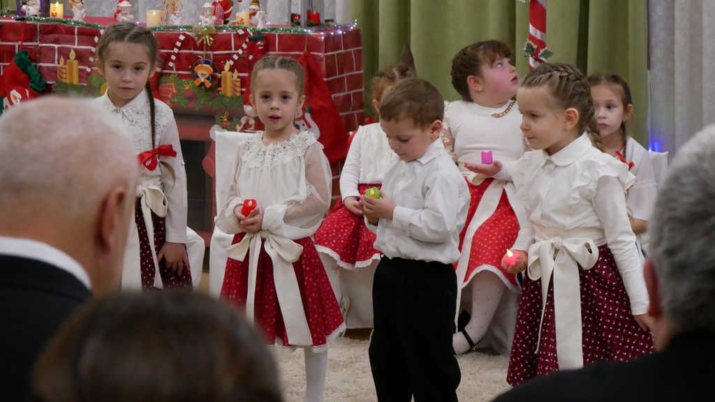 Most a karácsonyi műsorukkal kedveskedtek a vendégeknek. A szép viseletes ruhákba öltözött gyermekek versekkel, énekekkel elevenítették fel Jézus születését, és megható előadásukkal az ajándékozókat tették megajándékozottaká.